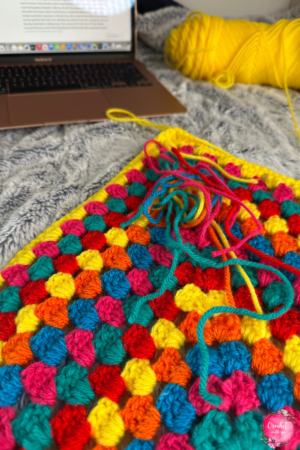 Close-up of bright granny squares showing easy beginner crochet stitches.
