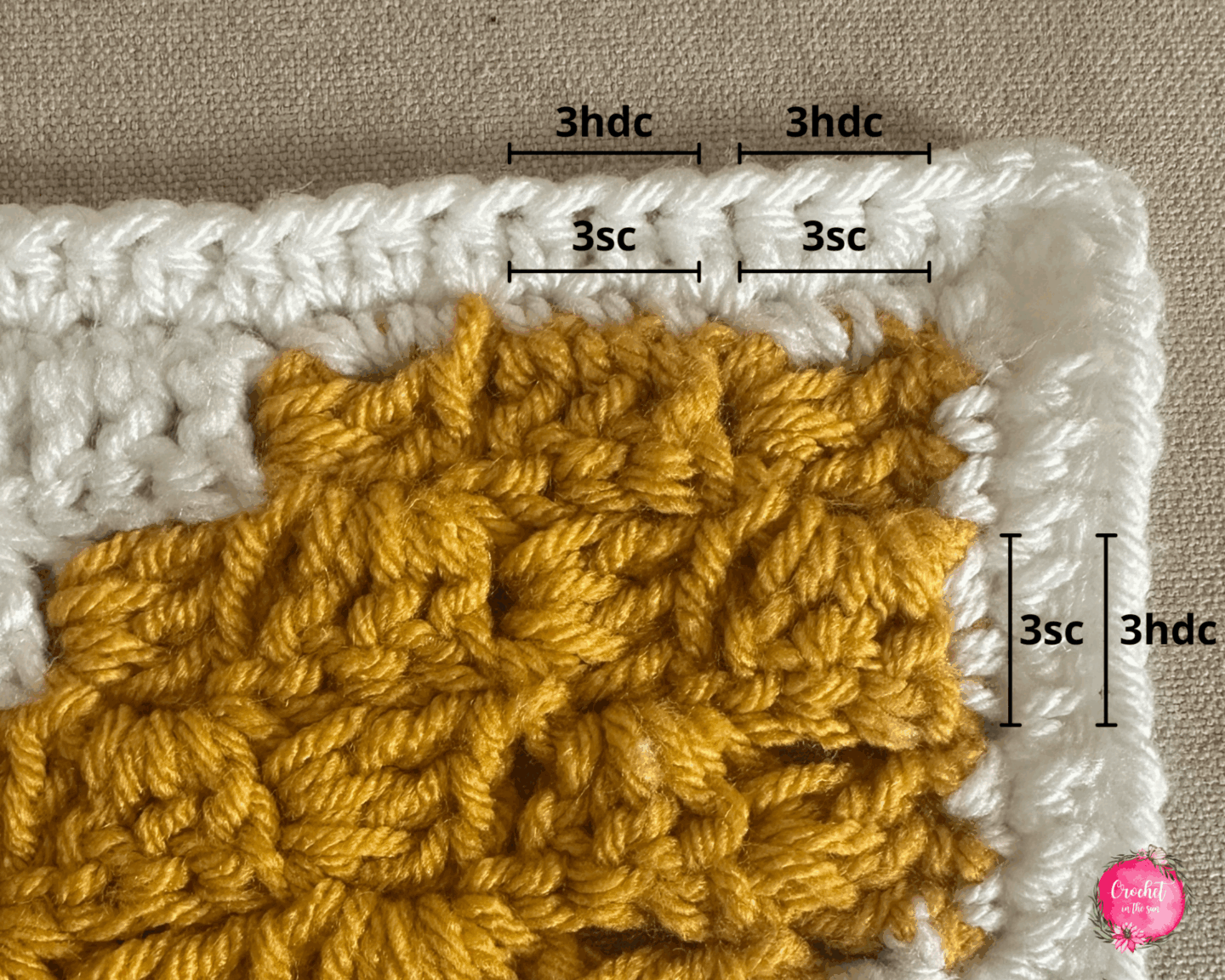 As you see above, you are working 3sc into each horizontal tile (where the dc’s appear horizontal, going left to right), and work 3sc into each vertical tile (where the dc’s appear vertical, going up to down). Note that some sides will be more obvious where to work the sc, while others might not be as obvious.